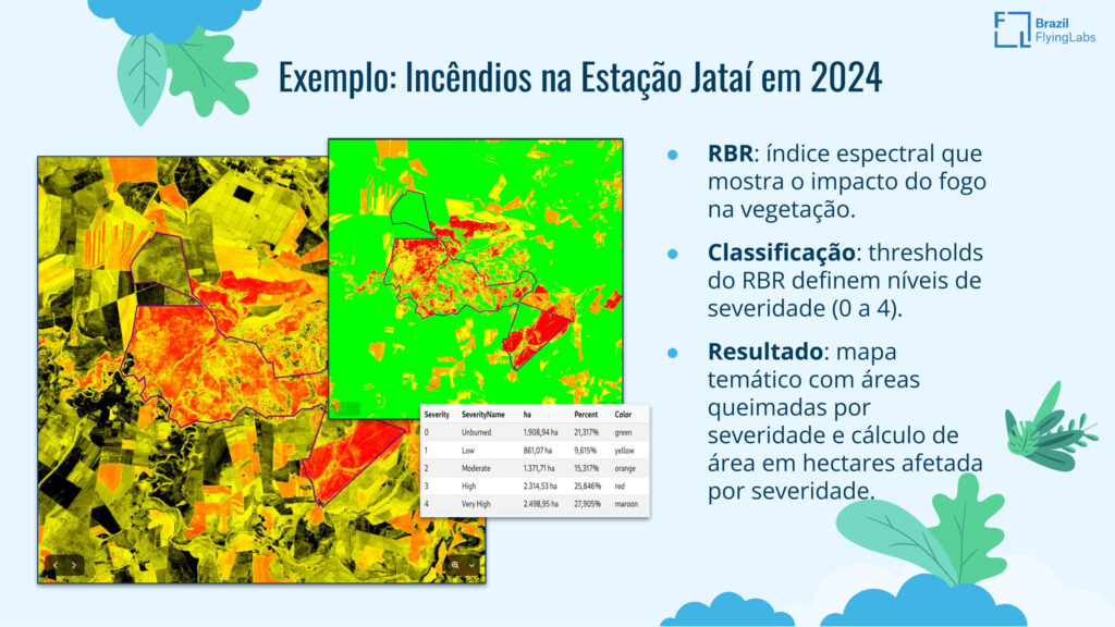 Esses dados são transformados em mapas temáticos interativos e indicadores quantitativos (área queimada em hectares e nível de severidade), apoiando órgãos ambientais, pesquisadores e gestores públicos nas ações de planejamento de restauração, mitigação e prevenção de novos incêndios.